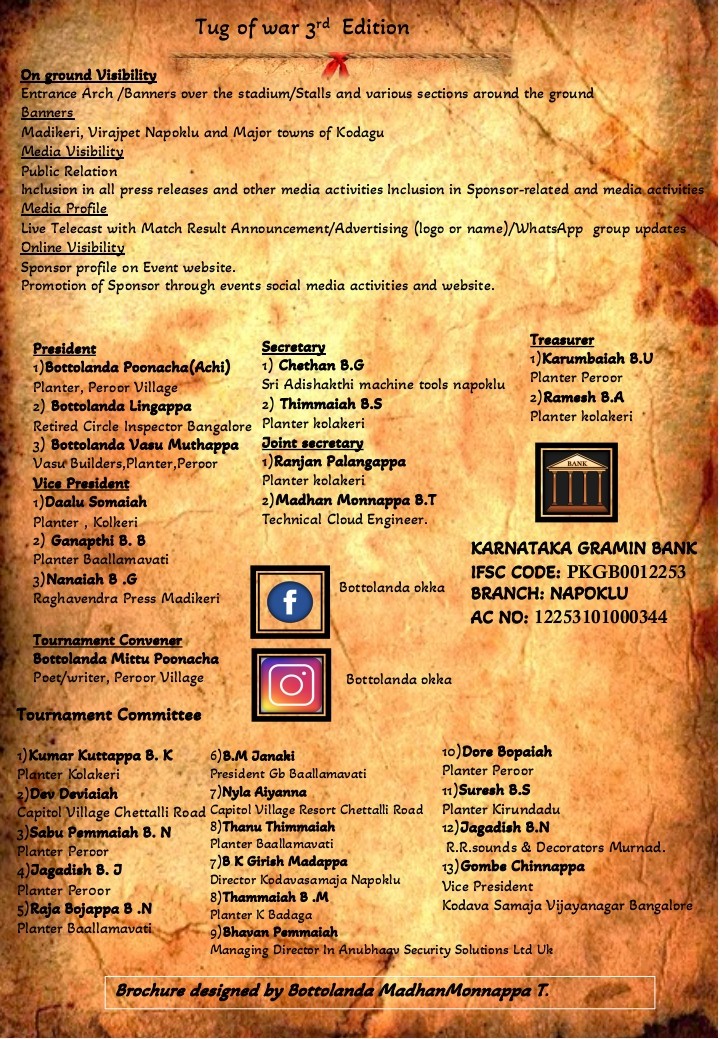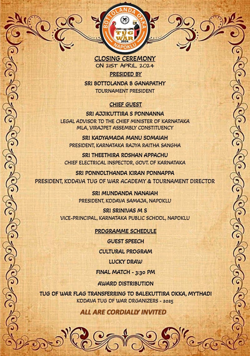 Bottolanda Okka, Napoklu successfully organised the Third Kodava Tug of War Festival in 2024 at Junior College Ground, Napoklu. The event brought together Kodava families in a spirited display of strength and community pride.